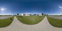 Panoramic view of a field in Ontario, Canada. A fire hydrant stands prominently in the foreground, surrounded by open grassy spaces. Modern architecture and residential areas line the straight road in the distance.