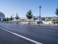 This photo captures the modern architecture and urban design of the financial district in Berlin, Germany. The empty street stretches ahead, flanked by office buildings on either side. The clear blue sky overhead contrasts with the trees in the foreground, creating a peaceful and vibrant cityscape. This image depicts a typical day in the bustling business district of Berlin, showcasing the city's unique blend of European charm and architectural innovation.