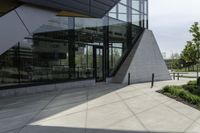 This is an image of a modern office building in the financial district of Toronto, Canada. The building's facade is made of composite materials and it has large windows. The concrete sidewalk in front of the building is empty, surrounded by a grassy area. The clear sky above reflects the urban design and modern architecture of the city. This photo represents the bustling city life and business district of Toronto.