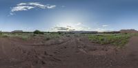 the view of a mountain that is reflected in a fish eye lens image of a dirt road with lots of dirt