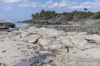 a picture of a beach with rocks and plants near the water's edge and a forested area on one side with the ocean in the background