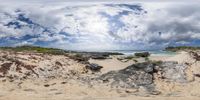 A 360° shot of a coastal beach in Florida, featuring sandy shores, rocky outcrops, and the vast expanse of the ocean. The cloudy sky adds drama to the landscape, while vegetation and trees frame the scene.