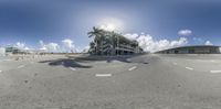 A digital rendering of an empty parking lot in Miami Beach, Florida. The straight road leads to the coastal harbor, with a jetty extending into the ocean. The clear sky casts a hard shadow on the asphalt surface.