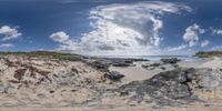 a panoramic view looking at the beach and sea with clouds overhead in an almost clear image