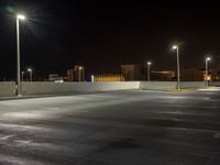 a deserted empty parking lot at night time with street lights illuminating in the distance over buildings