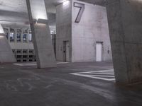 the floor at a parking garage has painted numbers in white writing on it and is illuminated by overhead lights
