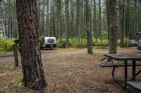 A rural road in Ontario, Canada, with wet grass and vegetation on the sides. Trees and bushes line the landscape, creating a serene forest scene. A car parked on the gravel road next to an outdoor bench adds a touch of tranquility.