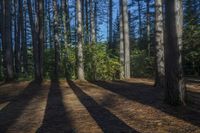 shadow of the trees from different directions on the ground in the forest, casting bright lights