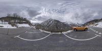 A gloomy winter day in the Alps of France. The grey sky and foul weather create a somber atmosphere. A straight road leads to a parking lot, with a parked orange pick-up truck. Majestic mountains covered in snow complete the landscape.