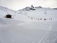 a snowy area covered in snow and ski lift on top of a mountain covered in snow