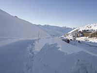 A stunning winter landscape in the French Alps. Snow-covered mountains and clear skies surround a ski track. The surface is ideal for tourism and attracts tourists from all over Europe. A perfect day for skiing in the Alps.