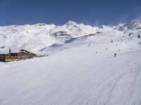 a mountain with some snow and a snowy hill with mountains behind it and skiiers in the foreground