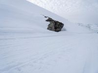there is a person skiing on snow covered slope in the wintertime with clouds above
