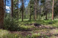 a pine forest with sparse grass on the ground and tall trees behind it and an opening in the distance
