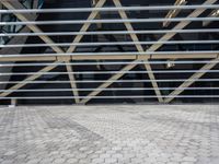 a building with some metal bars and bricks flooring on the outside of it in sunlight