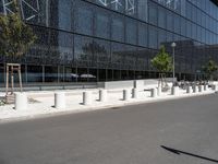 A modern office building in Berlin, Germany. The futuristic architecture stands out against the grey urban landscape. Trees line the streets, adding vegetation to the metropolitan area. The building is located in the business and financial district, symbolizing the city's vibrant city life.
