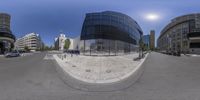 A high definition 360-view of a busy intersection in Berlin, Germany. The modern architecture of the buildings and the sleek design of the road and sidewalks create a futuristic cityscape. Cars and pedestrians fill the scene, capturing the vibrant city life.