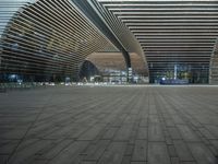 This image showcases the mesmerizing night cityscape of a modern architecture business district. The concrete structures, with their symmetrical patterns and neon lights, create a futuristic and vibrant atmosphere. The open spaces and courtyards provide a public space for city life, while the office buildings stand tall as a symbol of urban design. The artwork and flooring add to the aesthetic appeal of the scene. The dark sky and artificial lights create a captivating contrast. This photo represents the unique blend of art, business, and urban life in a modern city.