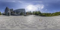 A fish-eye lens captures a panoramic view of a futuristic architectural structure in the city. The building stands tall and high, with a modern design and straight roads. The sun casts hard shadows, creating a dramatic effect.