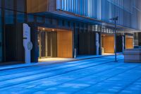 A modern cityscape in Shanghai's bustling business district. Neon lights illuminate the futuristic architecture, creating a vibrant city life. The empty blue sidewalk contrasts with the dark buildings, giving a glimpse of the urban design.