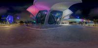 an artistic building with colorful lights and lights in front of it at night, viewed from the sidewalk