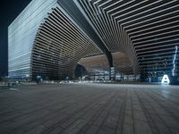 A futuristic architecture in the heart of a bustling city. The modern building's facade is illuminated by neon lights at night, creating an enchanting cityscape. The symmetrical design and open spaces exude a sense of urban sophistication.