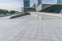Skateboarder performing tricks on the cement surface in Guangzhou, China. Futuristic architecture surrounds the open space, creating a modern cityscape. Clear sky adds to the urban vibe of this bustling Guangdong city.