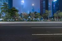 a city street with buildings and neon lights at night time in hong china as seen from an empty city highway