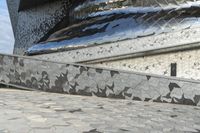 This is an image of a modern architectural structure in Paris, France. The building features a futuristic design with a combination of cobble stone, rock, and tile flooring. The facade is made up of stone walls and brick elements, creating a unique pattern and line structure. The image captures the urban design of the city, with a parking deck and garage in the foreground. The architectural structure is a museum, showcasing the rich history and art of France. This photo represents the blend of modern and historical elements in Paris.