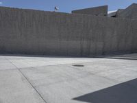 Futuristic architecture in Tenerife, Spain. A large concrete block wall extends above the sidewalk. The open space beneath creates a modern, urban feel. Clear sky and granite surfaces complete the European scene.