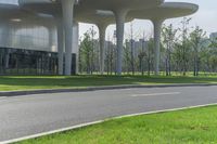 a couple of motorcycles riding down a paved road near a large building near some trees