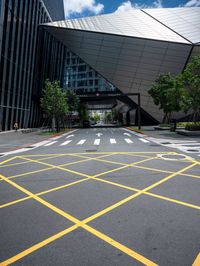 This stock photo showcases a modern urban design in Taipei City, Taiwan. The image features a building surrounded by vegetation and trees. The asphalt parking lot with painted yellow lines leads straight down the road. The clear sky above adds to the urban atmosphere of the city. This photo captures the essence of city life in Taipei, with its futuristic architecture and modern urban design.