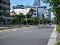 An empty road lined with trees and street signs in front of a backdrop of tall buildings in Taipei City, Taiwan. The modern and futuristic architecture reflects the vibrant urban design of this bustling Asian city.