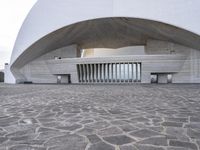 This stock photo features a stunning example of modern architecture in Spain. The image showcases a building constructed into an archway shape, with a stone floor and a circular walkway. The concrete facade, clean lines, and futuristic design create a visually striking composition. The open space and ample natural light give a sense of airy and spacious ambiance. With its unique architectural elements and urban design, this building stands out in the cityscape of Tenerife, Europe. The blue sky with clouds adds a touch of serenity to the scene. This image perfectly captures the combination of Brutalist architecture and contemporary design, making it an ideal choice for projects related to urban development, architecture, and city life.
