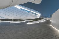 a night shot of a curved walkway at an art museum with white walls and steps that lead to a circular roof