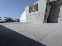 A modern architectural masterpiece in Tenerife, Spain. The building boasts a concrete wall with a giant screen, creating a futuristic and open space feel. Clear skies complement the sleek lines and surfaces, making it a perfect day for exploring this European gem.