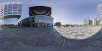 A modern architectural masterpiece in Barcelona's business district. The low-rise buildings and elevated structures create a futuristic cityscape. The clear sky and sunlight cast hard shadows on the surface, adding drama to the composition.