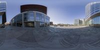A futuristic cityscape in Barcelona, Spain. The circular mirror lens captures three views of the city, with modern architecture and high-rise buildings. The clear sky provides a perfect backdrop for the symmetrical structures.
