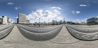 A futuristic cityscape in Ottawa, Canada. The panoramic view showcases modern architecture, glass walls, and high-rise buildings. The clear sky reflects off the metal and glass surfaces, creating a vibrant urban landscape. A symphony of urban design and infrastructure.