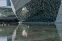 A futuristic glass structure building in Guangzhou, China. The clear sky reflects in the water foreground as a person walks through the open space. Modern architecture and urban cityscape define this concrete surface.