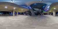 A futuristic museum building illuminated by neon lights at night. The entrance features a curved roof and stairs, creating a visually striking architectural structure. The panorama view showcases the modern design and ambiance of the city.