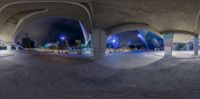 A futuristic park at night, with a vibrant mix of neon lights and artificial light. The small park features benches and modern architectural structures. The cityscape creates a symmetrical and vibrant atmosphere.