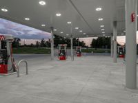 An empty gas station at dusk, illuminated by artificial light. Red pumps line the concrete surface. Clouds in the sky hint at the approaching night. A momentary pause in the day's activity.
