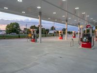 A gas station on a sunny day, with concrete surfaces and gas pumps on either side. Artificial light illuminates the area. The service station offers convenience and safety for drivers.