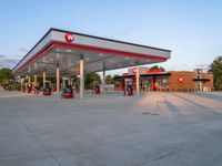gas station at the edge of a street next to a large white building with red trimming