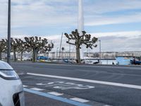 A view of the city of Geneva, France with a clear sky and a calm lake in the foreground. The urban design features a road lined with asphalt, leading to a pier and jetty. City life thrives amidst the serene surroundings of Europe.
