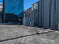Daytime urban scene in Atlanta, Georgia. Modern architecture dominates the city skyline with clear skies above. A bustling business district with office buildings and parking decks. Concrete surfaces and open spaces accentuate the city life.