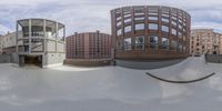 A person riding a skateboard down a ramp in Hamburg, Germany. Modern architecture and classic brick buildings surround a residential area. The sky with clouds adds depth to the urban landscape.