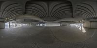 Modern architecture in a metropolitan area of Germany. An empty building showcasing a monochromatic interior design with circles covering the floor. The fisheye perspective adds a unique touch.