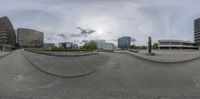 Aerial view of Hamburg, Germany's modern architecture and urban design. Straight roads lead through the business district, with office buildings and parking garages. Clouds float above the high position, showcasing Deutschland's urban landscape.